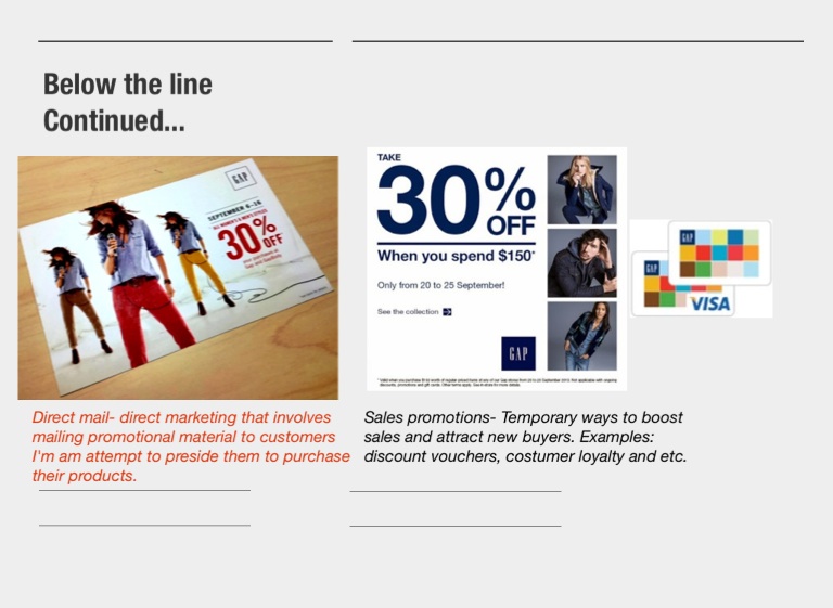 Sales promotions- Temporary ways to boost sales and attract new buyers. Examples: discount vouchers, costumer loyalty and etc.
