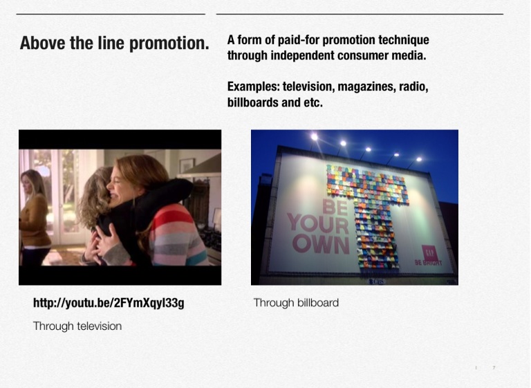 A form of paid-for promotion technique through independent consumer media. Examples: television, magazines, radio, billboards and etc.