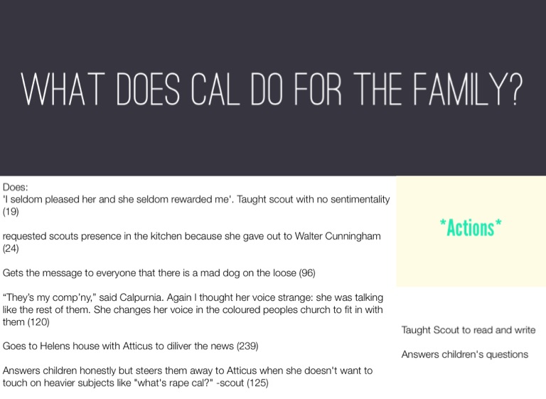 Answers children honestly but steers them away to Atticus when she doesn't want to touch on heavier subjects like "what's rape cal?" -scout (125)