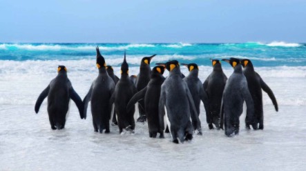 King penguins are big birds that swim.They have big wife are call flippers.King penguins are 3 feet tolle.They have orange feathers on the chest and ears.