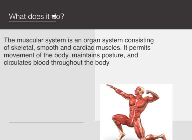 The muscular system is an organ system consisting of skeletal, smooth and cardiac muscles. It permits movement of the body, maintains posture, and circulates blood throughout the body