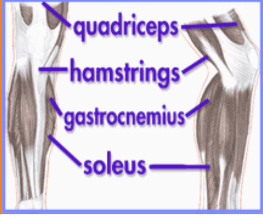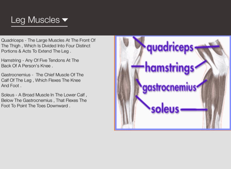 Quadriceps - The Large Muscles At The Front Of The Thigh , Which Is Divided Into Four Distinct Portions & Acts To Extend The Leg .