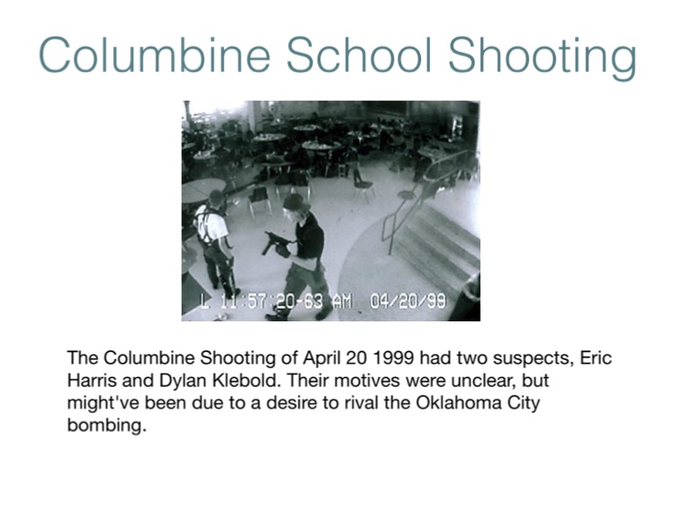 The Columbine Shooting of April 20 1999 had two suspects, Eric Harris and Dylan Klebold. Their motives were unclear, but might've been due to a desire to rival the Oklahoma City bombing.