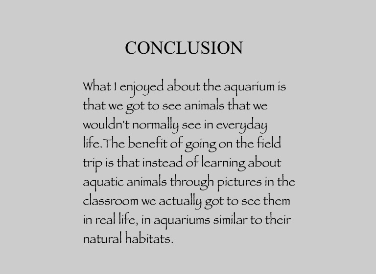 What I enjoyed about the aquarium is that we got to see animals that we wouldn't normally see in everyday life.The benefit of going on the field trip is that instead of learning about aquatic animals through pictures in the classroom we actually got to see them in real life, in aquariums similar to their natural habitats.