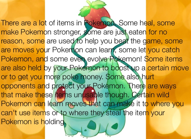 There are a lot of items in Pokemon. Some heal, some make Pokemon stronger, some are just eaten for no reason, some are used to help you beat the game, some are moves your Pokemon can learn, some let you catch Pokemon, and some even evolve Pokemon! Some items are also held by your Pokemon to boost up a certain move or to get you more poke money. Some also hurt opponents and protect your Pokemon. There are ways that make these items unusable though. Certain wild Pokemon can learn moves that can make it to where you can't use items or to where they steal the item your Pokemon is holding.