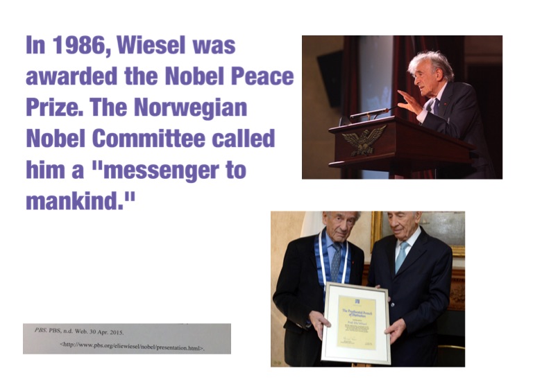 In 1986, Wiesel was awarded the Nobel Peace Prize. The Norwegian Nobel Committee called him a "messenger to mankind."