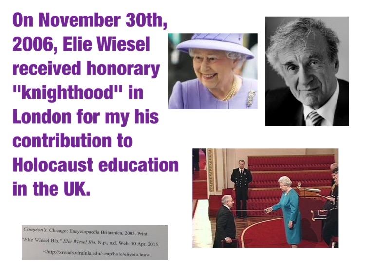 On November 30th, 2006, Elie Wiesel received honorary "knighthood" in London for my his contribution to Holocaust education in the UK.