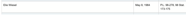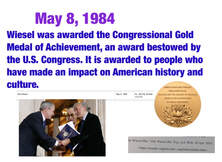 Wiesel was awarded the Congressional Gold Medal of Achievement, an award bestowed by the U.S. Congress. It is awarded to people who have made an impact on American history and culture.