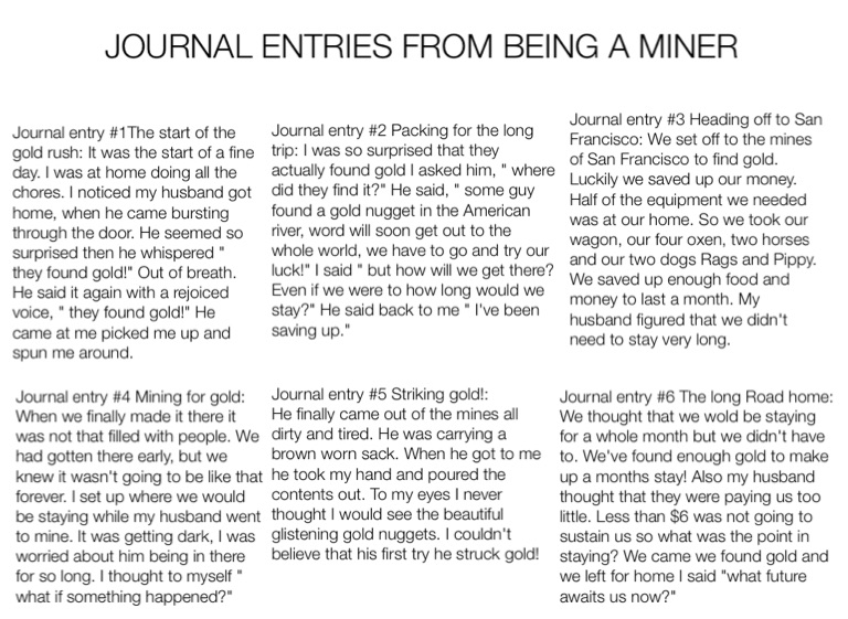 Journal entry #1The start of the gold rush: It was the start of a fine day. I was at home doing all the chores. I noticed my husband got home, when he came bursting through the door. He seemed so surprised then he whispered " they found gold!" Out of breath. He said it again with a rejoiced voice, " they found gold!" He came at me picked me up and spun me around.