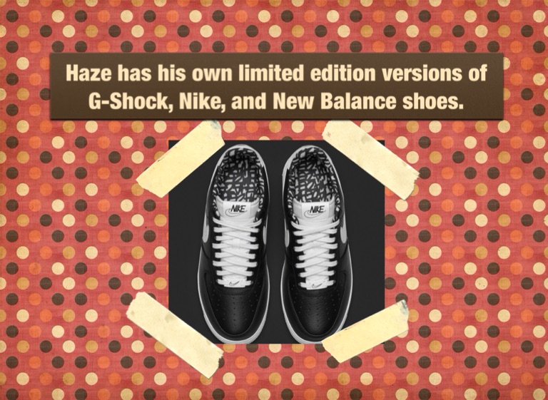 Haze has his own limited edition versions of G-Shock, Nike, and New Balance shoes.