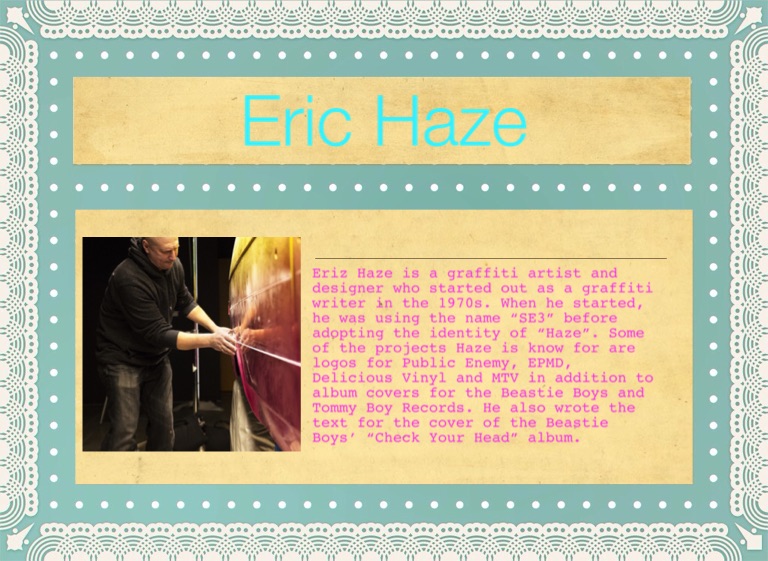 Eriz Haze is a graffiti artist and designer who started out as a graffiti writer in the 1970s. When he started, he was using the name “SE3″ before adopting the identity of “Haze”. Some of the projects Haze is know for are logos for Public Enemy, EPMD, Delicious Vinyl and MTV in addition to album covers for the Beastie Boys and Tommy Boy Records. He also wrote the text for the cover of the Beastie Boys’ “Check Your Head” album.