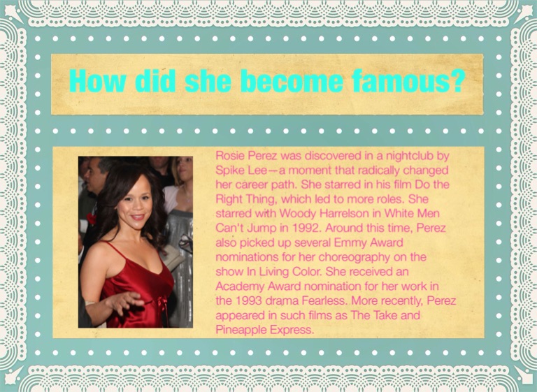 Rosie Perez was discovered in a nightclub by Spike Lee—a moment that radically changed her career path. She starred in his film Do the Right Thing, which led to more roles. She starred with Woody Harrelson in White Men Can't Jump in 1992. Around this time, Perez also picked up several Emmy Award nominations for her choreography on the show In Living Color. She received an Academy Award nomination for her work in the 1993 drama Fearless. More recently, Perez appeared in such films as The Take and Pineapple Express.