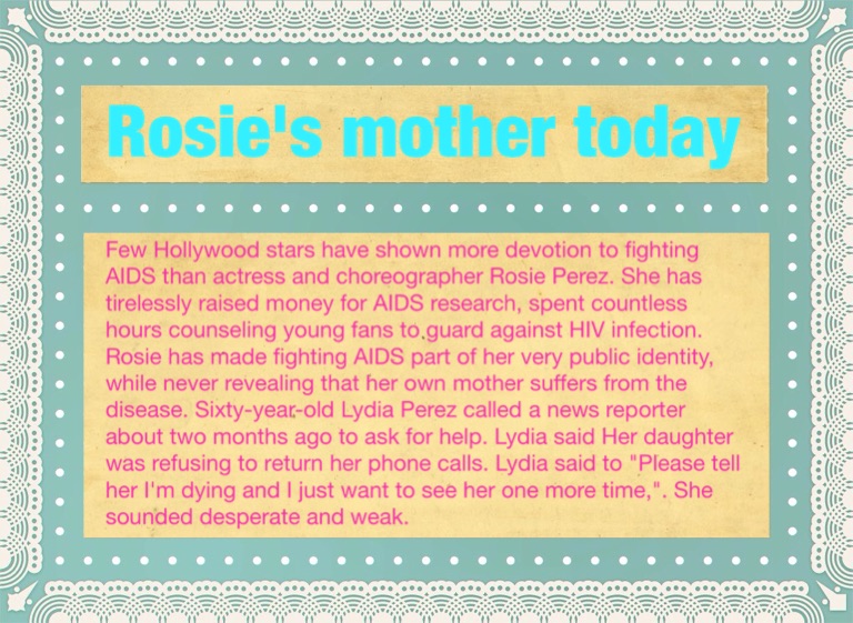 Few Hollywood stars have shown more devotion to fighting AIDS than actress and choreographer Rosie Perez. She has tirelessly raised money for AIDS research, spent countless hours counseling young fans to guard against HIV infection. Rosie has made fighting AIDS part of her very public identity, while never revealing that her own mother suffers from the disease. Sixty-year-old Lydia Perez called a news reporter about two months ago to ask for help. Lydia said Her daughter was refusing to return her phone calls. Lydia said to "Please tell her I'm dying and I just want to see her one more time,". She sounded desperate and weak.