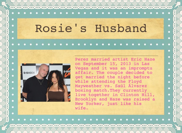 Perez married artist Eric Haze on September 15, 2013 in Las Vegas and it was an impromptu affair. The couple decided to get married the night before while attending the Floyd Mayweather vs. Saúl Álvarez boxing match.They currently live together in Clinton Hill, Brooklyn and Haze was raised a New Yorker, just like his wife.
