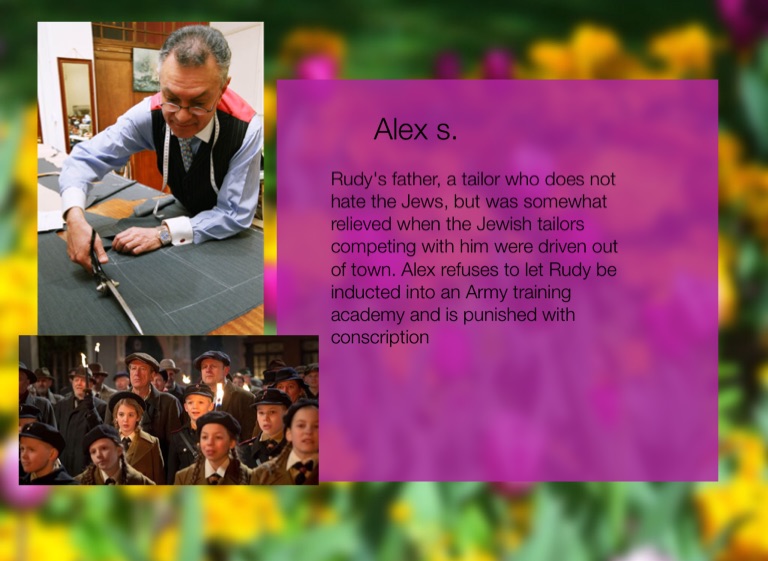 Rudy's father, a tailor who does not hate the Jews, but was somewhat relieved when the Jewish tailors competing with him were driven out of town. Alex refuses to let Rudy be inducted into an Army training academy and is punished with conscription