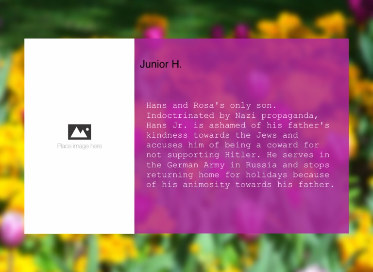 Hans and Rosa's only son. Indoctrinated by Nazi propaganda, Hans Jr. is ashamed of his father's kindness towards the Jews and accuses him of being a coward for not supporting Hitler. He serves in the German Army in Russia and stops returning home for holidays because of his animosity towards his father.