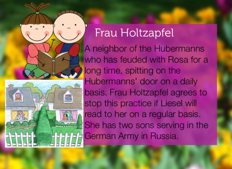 A neighbor of the Hubermanns who has feuded with Rosa for a long time, spitting on the Hubermanns' door on a daily basis. Frau Holtzapfel agrees to stop this practice if Liesel will read to her on a regular basis. She has two sons serving in the German Army in Russia.
