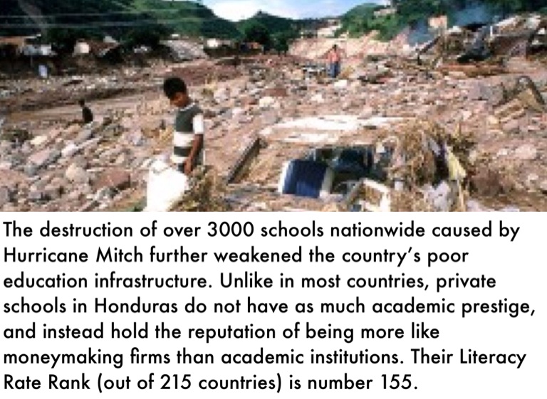 The destruction of over 3000 schools nationwide caused by Hurricane Mitch further weakened the country’s poor education infrastructure. Unlike in most countries, private schools in Honduras do not have as much academic prestige, and instead hold the reputation of being more like moneymaking firms than academic institutions. Their Literacy Rate Rank (out of 215 countries) is number 155.