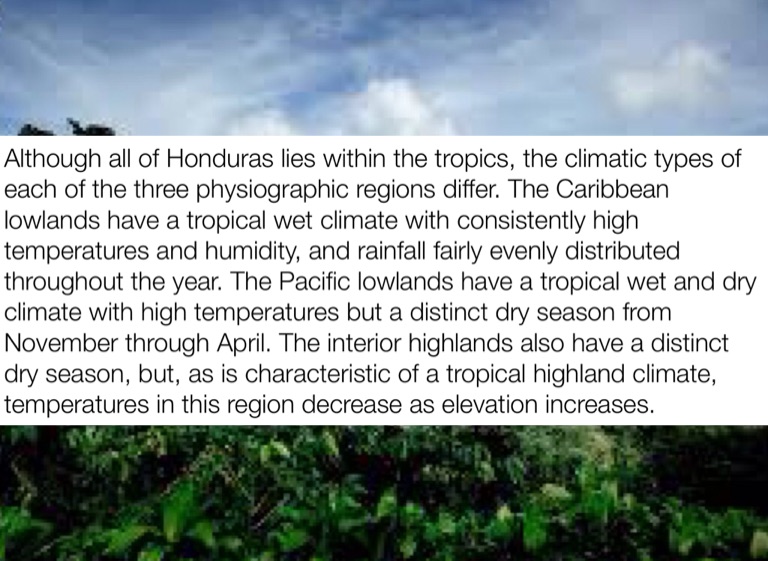 Although all of Honduras lies within the tropics, the climatic types of each of the three physiographic regions differ. The Caribbean lowlands have a tropical wet climate with consistently high temperatures and humidity, and rainfall fairly evenly distributed throughout the year. The Pacific lowlands have a tropical wet and dry climate with high temperatures but a distinct dry season from November through April. The interior highlands also have a distinct dry season, but, as is characteristic of a tropical highland climate, temperatures in this region decrease as elevation increases.