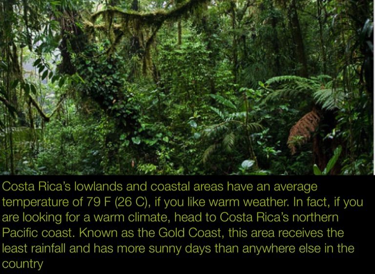 Costa Rica’s lowlands and coastal areas have an average temperature of 79 F (26 C), if you like warm weather. In fact, if you are looking for a warm climate, head to Costa Rica’s northern Pacific coast. Known as the Gold Coast, this area receives the least rainfall and has more sunny days than anywhere else in the country