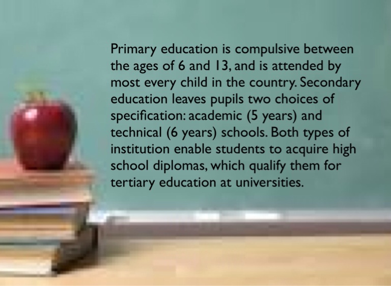 Primary education is compulsive between the ages of 6 and 13, and is attended by most every child in the country. Secondary education leaves pupils two choices of specification: academic (5 years) and technical (6 years) schools. Both types of institution enable students to acquire high school diplomas, which qualify them for tertiary education at universities.