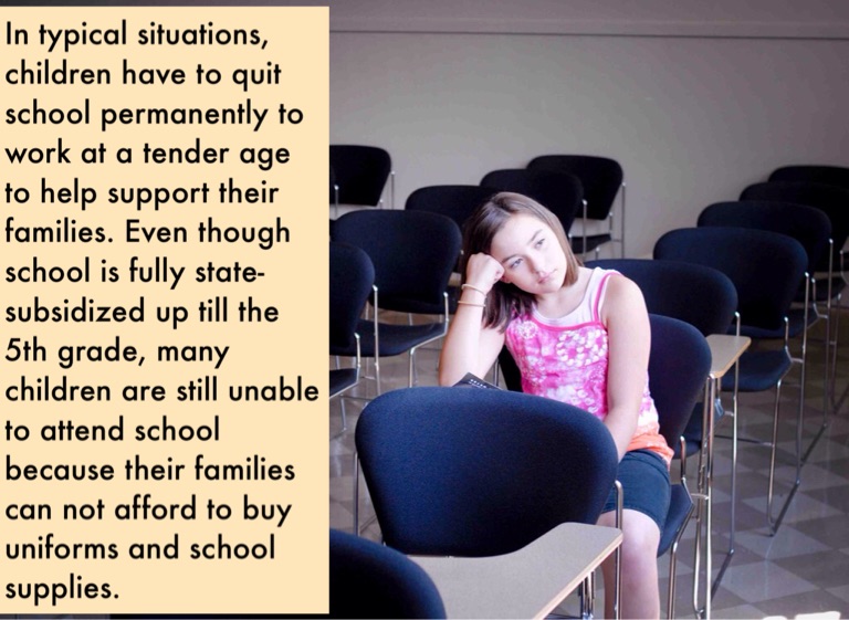In typical situations, children have to quit school permanently to work at a tender age to help support their families. Even though school is fully state-subsidized up till the 5th grade, many children are still unable to attend school because their families can not afford to buy uniforms and school supplies.