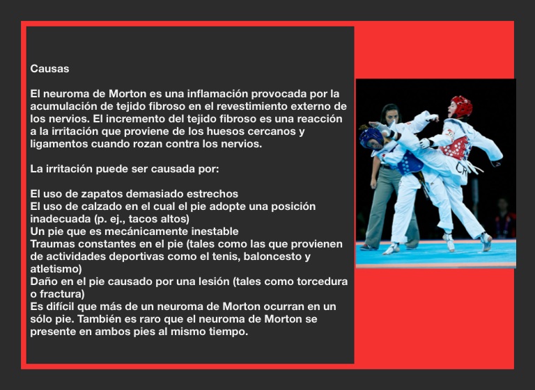 El neuroma de Morton es una inflamación provocada por la acumulación de tejido fibroso en el revestimiento externo de los nervios. El incremento del tejido fibroso es una reacción a la irritación que proviene de los huesos cercanos y ligamentos cuando rozan contra los nervios.