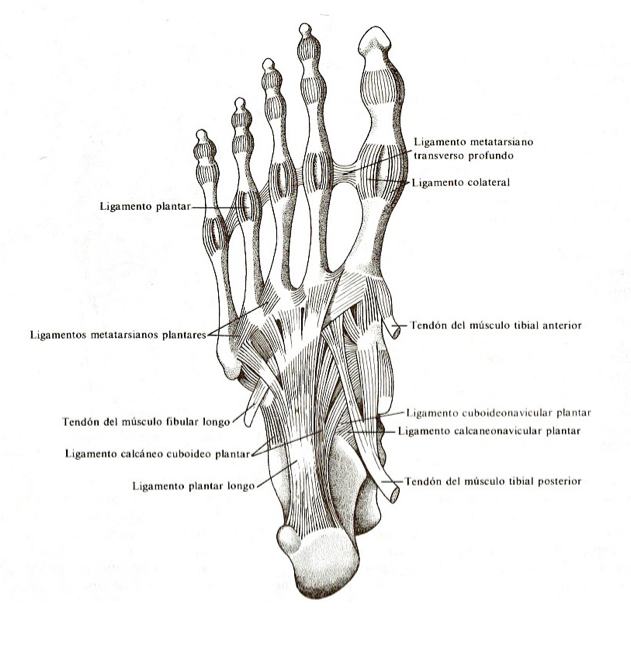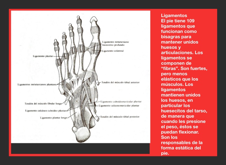El pie tiene 109 ligamentos que funcionan como bisagras para mantener unidos huesos y articulaciones. Los ligamentos se componen de “fibras”. Son fuertes, pero menos elásticos que los músculos. Los ligamentos mantienen unidos los huesos, en particular los huesecitos del tarso, de manera que cuando les presione el peso, éstos se puedan flexionar. Son los responsables de la forma estática del pie.