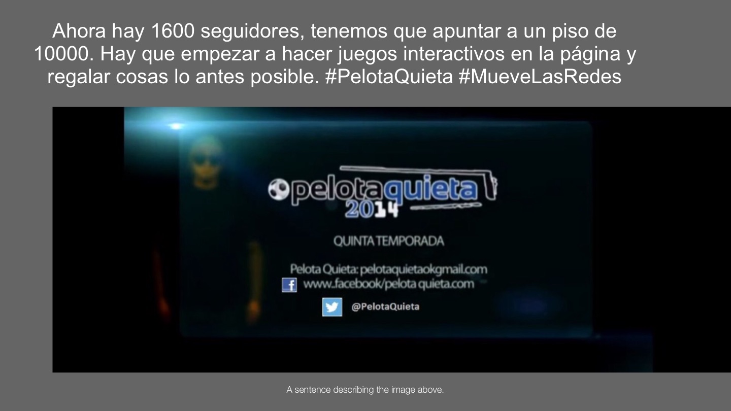 Ahora hay 1600 seguidores, tenemos que apuntar a un piso de 10000. Hay que empezar a hacer juegos interactivos en la página y regalar cosas lo antes posible. #PelotaQuieta #MueveLasRedes