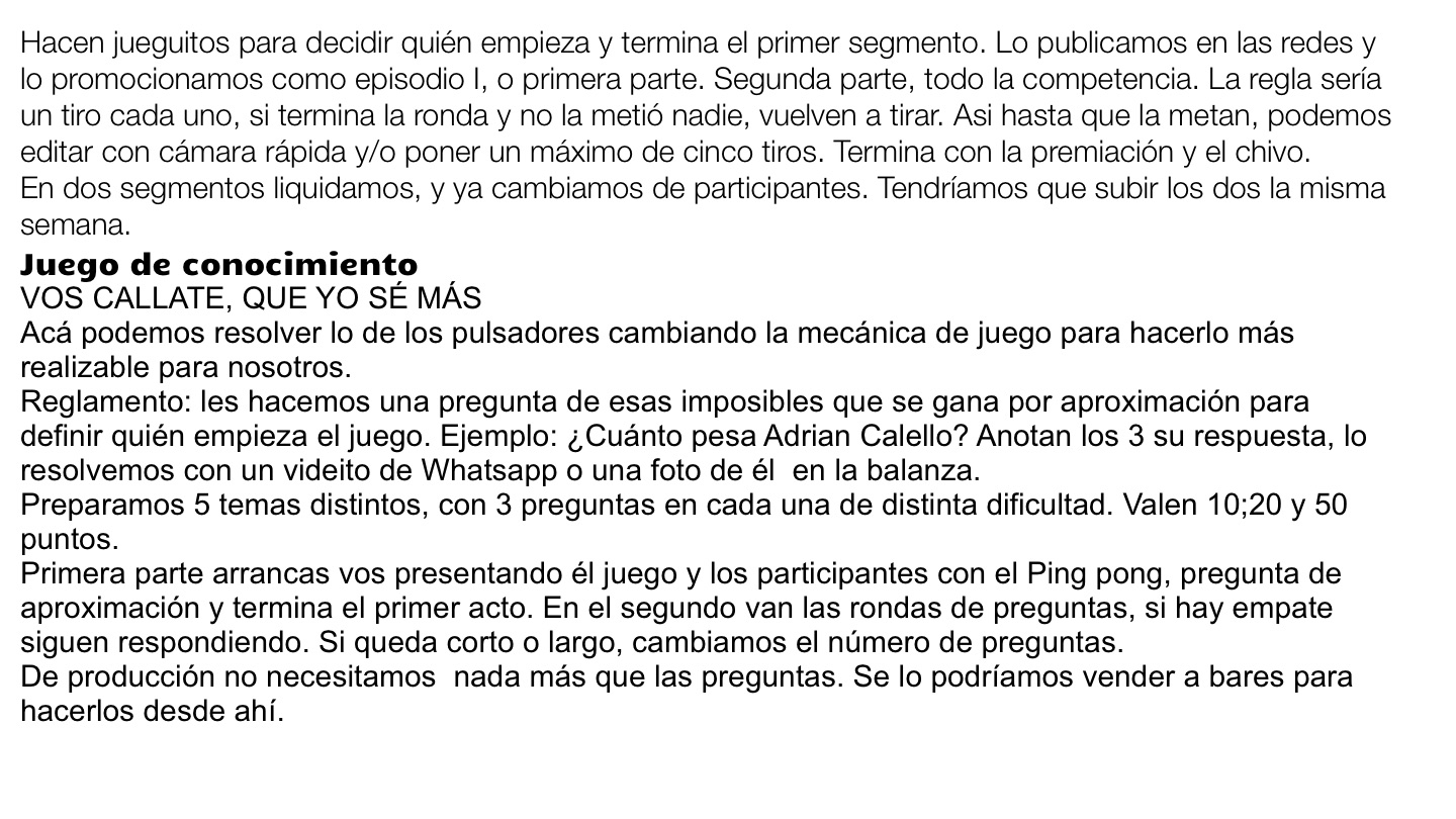 Reglamento: les hacemos una pregunta de esas imposibles que se gana por aproximación para definir quién empieza el juego. Ejemplo: ¿Cuánto pesa Adrian Calello? Anotan los 3 su respuesta, lo resolvemos con un videito de Whatsapp o una foto de él en la balanza.