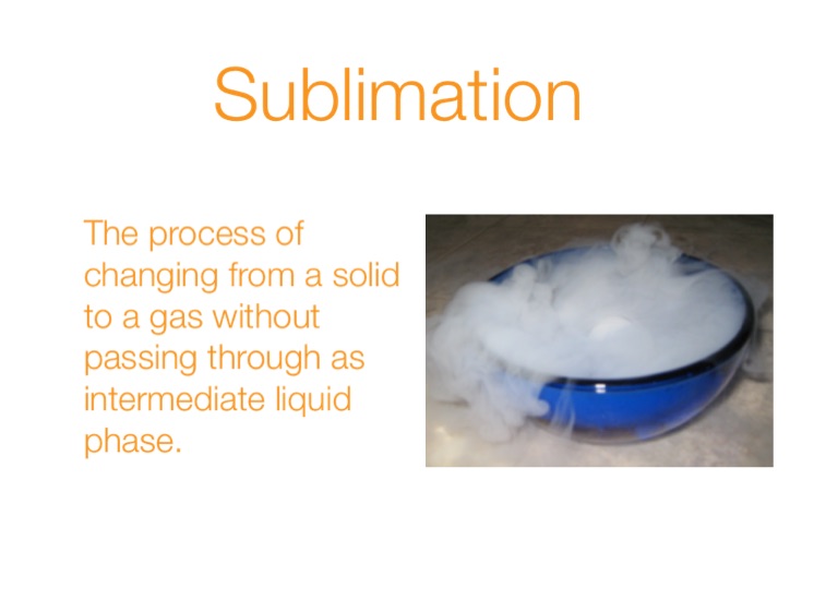 The process of changing from a solid to a gas without passing through as intermediate liquid phase.