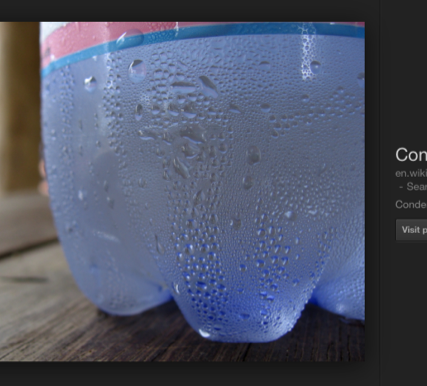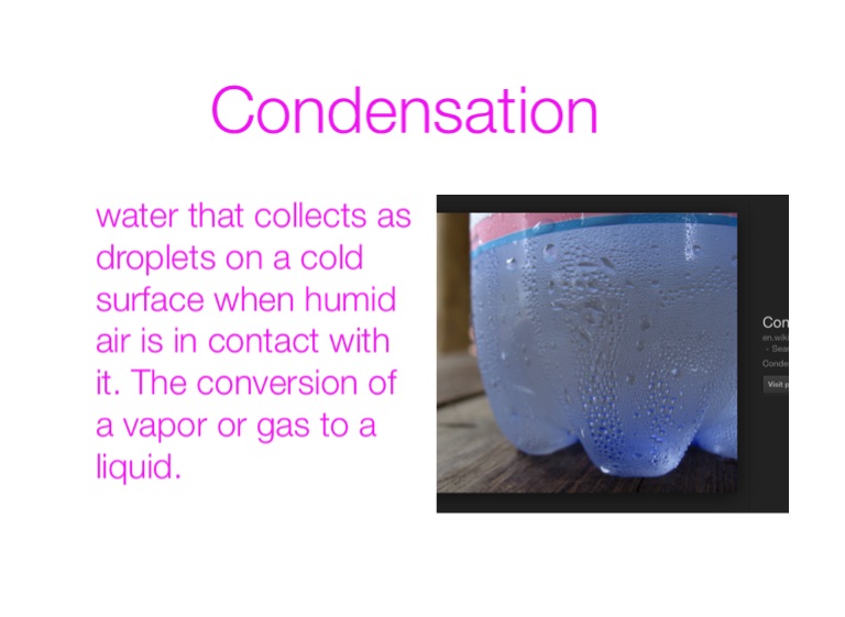 water that collects as droplets on a cold surface when humid air is in contact with it. The conversion of a vapor or gas to a liquid.