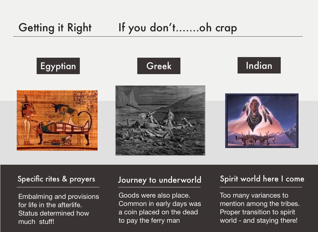 Too many variances to mention among the tribes. Proper transition to spirit world - and staying there!