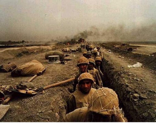 The war that happened between these countries effected many people throughout these two countries and the countries all together. Lots of damages happened, almost 7 million dollars in damages. So information not explained is that Suddam Hussein started the war between these two countries because wanted to have more power. So he is the reason that all these damages happened and why so many lives were lost in this war. This is important to know because without him, the world could have missed out on this war between the two countries and a lot of lives would have been saved. In this image it shows soldiers in a trench fighting for their country. Without Suddam Hussein, they would not be there, and neither would this war.