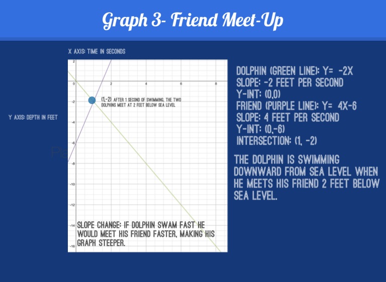 Slope change: if dolphin swam fast he would meet his friend faster, making his graph steeper.