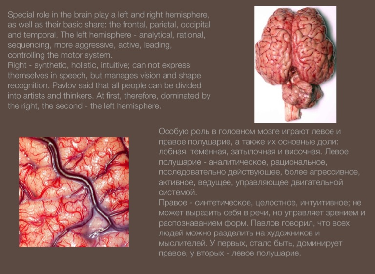 Правое - синтетическое, целостное, интуитивное; не может выразить себя в речи, но управляет зрением и распознаванием форм. Павлов говорил, что всех людей можно разделить на художников и мыслителей. У первых, стало быть, доминирует правое, у вторых - левое полушарие.