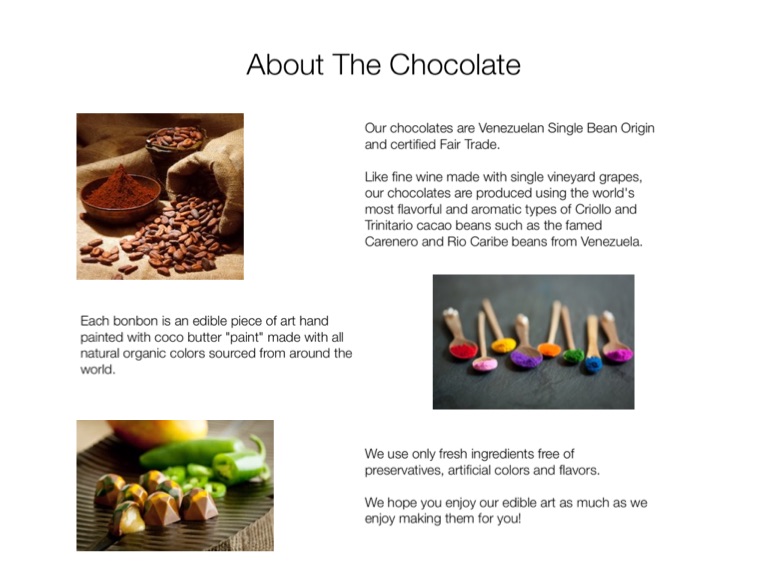Our chocolates are Venezuelan Single Bean Origin and certified Fair Trade.