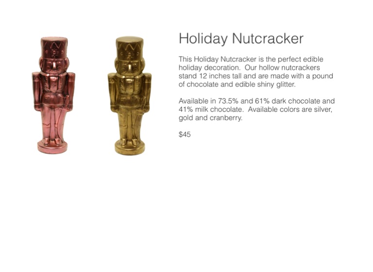 This Holiday Nutcracker is the perfect edible holiday decoration. Our hollow nutcrackers stand 12 inches tall and are made with a pound of chocolate and edible shiny glitter.