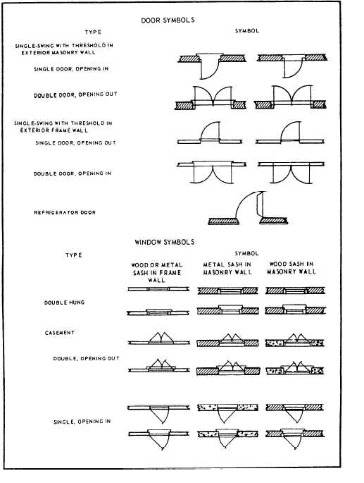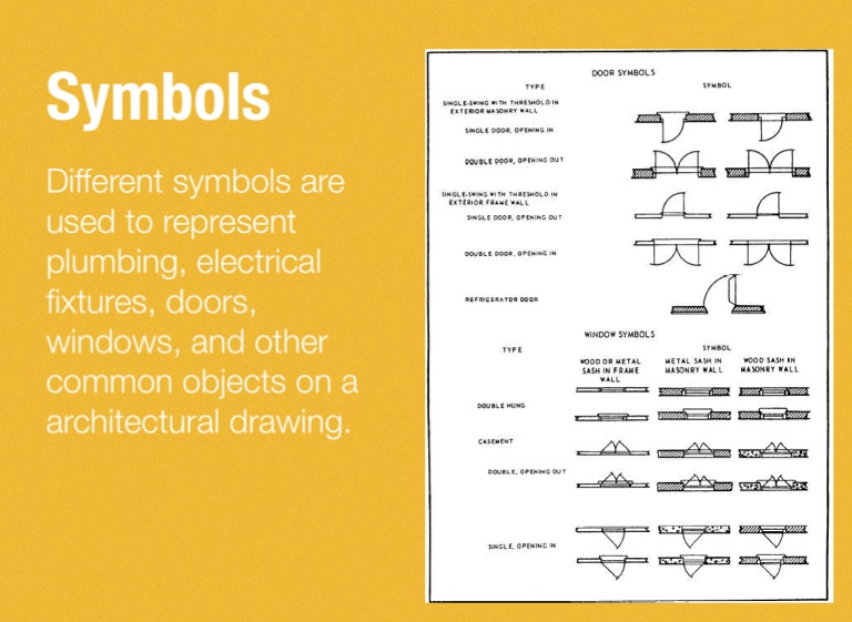Different symbols are used to represent plumbing, electrical fixtures, doors, windows, and other common objects on a architectural drawing.