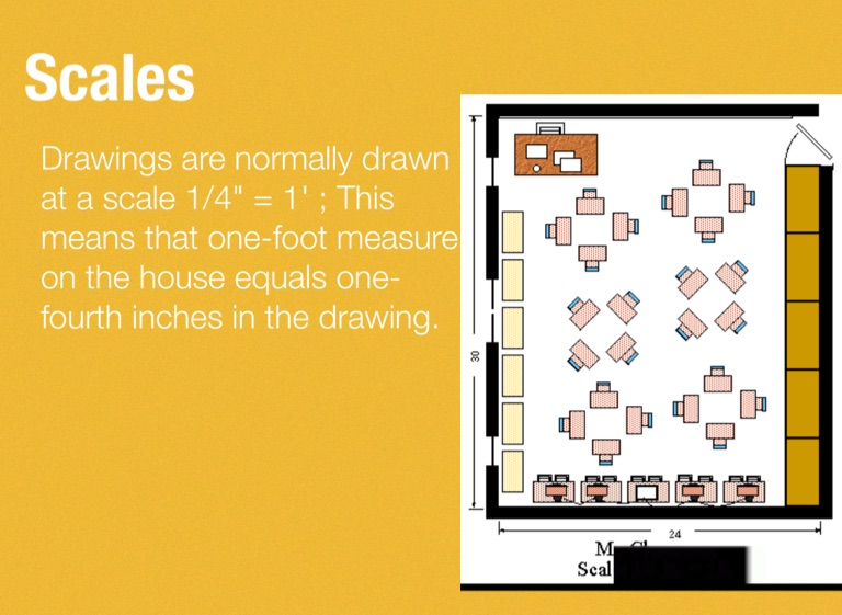Drawings are normally drawn at a scale 1/4" = 1' ; This means that one-foot measure on the house equals one-fourth inches in the drawing.