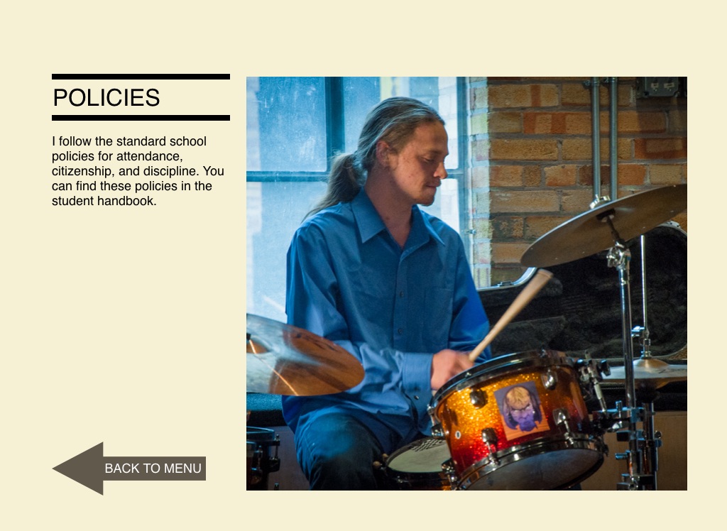 I follow the standard school policies for attendance, citizenship, and discipline. You can find these policies in the student handbook.