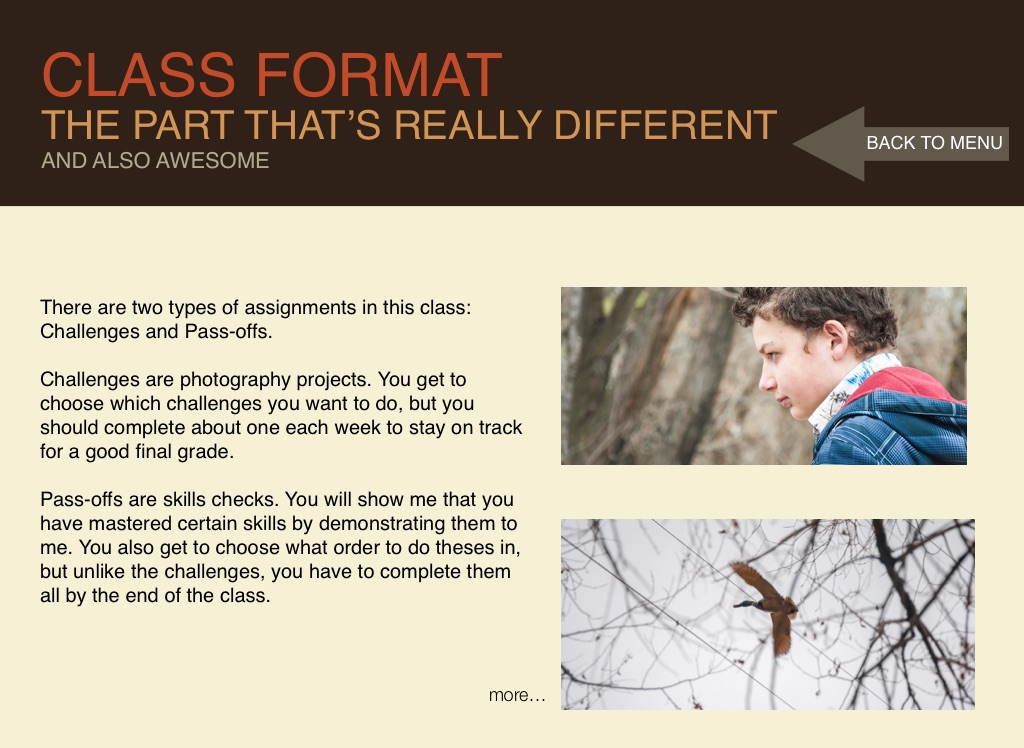 Challenges are photography projects. You get to choose which challenges you want to do, but you should complete about one each week to stay on track for a good final grade.