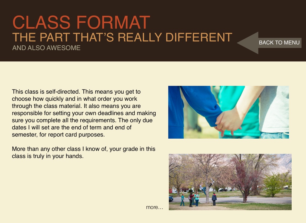 This class is self-directed. This means you get to choose how quickly and in what order you work through the class material. It also means you are responsible for setting your own deadlines and making sure you complete all the requirements. The only due dates I will set are the end of term and end of semester, for report card purposes.