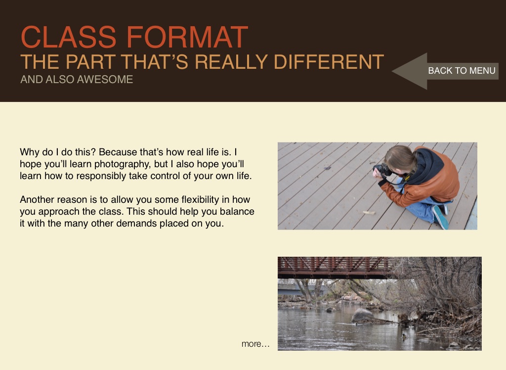 Why do I do this? Because that’s how real life is. I hope you’ll learn photography, but I also hope you’ll learn how to responsibly take control of your own life.