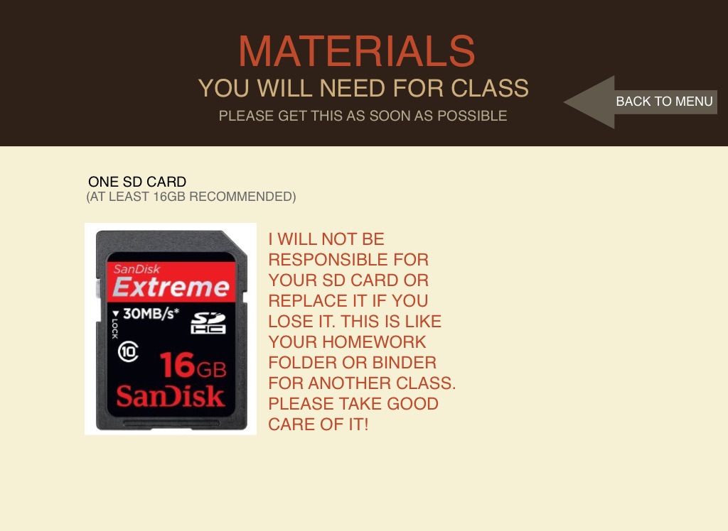 I WILL NOT BE RESPONSIBLE FOR YOUR SD CARD OR REPLACE IT IF YOU LOSE IT. THIS IS LIKE YOUR HOMEWORK FOLDER OR BINDER FOR ANOTHER CLASS. PLEASE TAKE GOOD CARE OF IT!