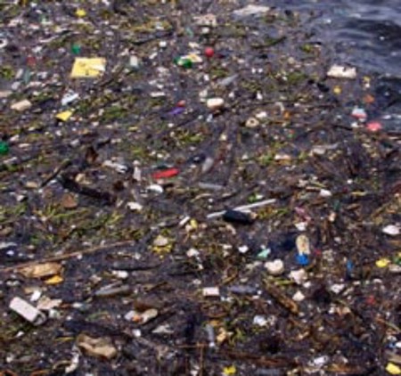 The trash that is thrown in the water collects in one area.