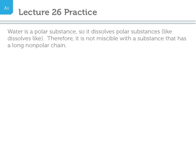 Water is a polar substance, so it dissolves polar substances (like dissolves like). Therefore, it is not miscible with a substance that has a long nonpolar chain.
