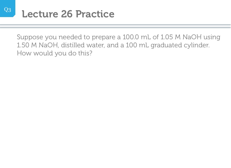 Suppose you needed to prepare a 100.0 mL of 1.05 M NaOH using 1.50 M NaOH, distilled water, and a 100 mL graduated cylinder. How would you do this?