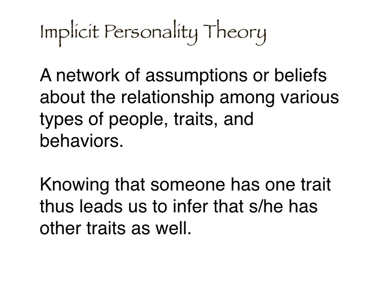 A network of assumptions or beliefs about the relationship among various types of people, traits, and behaviors.
