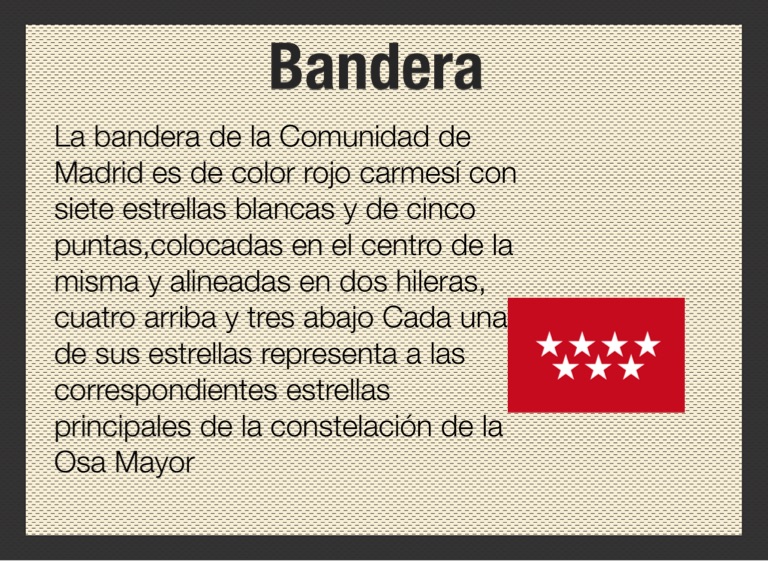 La bandera de la Comunidad de Madrid es de color rojo carmesí con siete estrellas blancas y de cinco puntas,colocadas en el centro de la misma y alineadas en dos hileras, cuatro arriba y tres abajo Cada una de sus estrellas representa a las correspondientes estrellas principales de la constelación de la Osa Mayor